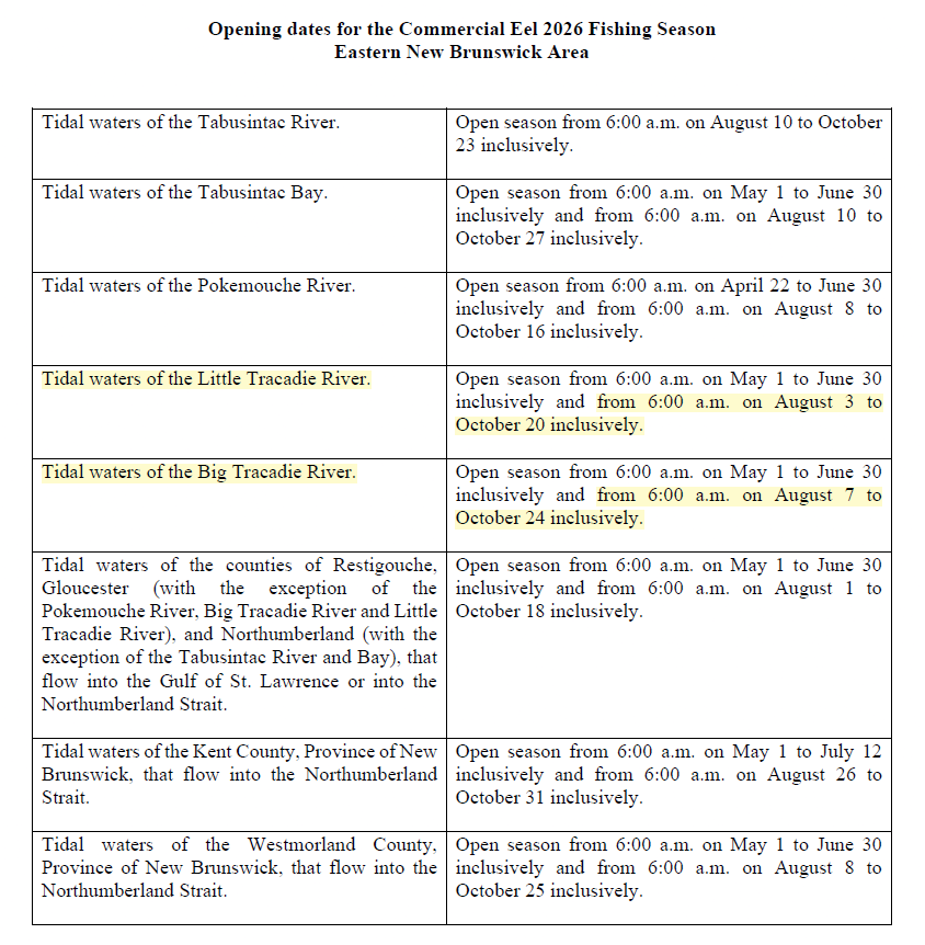 April 16, 2026 Communications UPM Commercial eel fishery – Eastern NB April 16, 2026 Communications UPM 2025 management measures are maintained for 2026.Here are the opening dates, with changes in yellow. Communications UPM